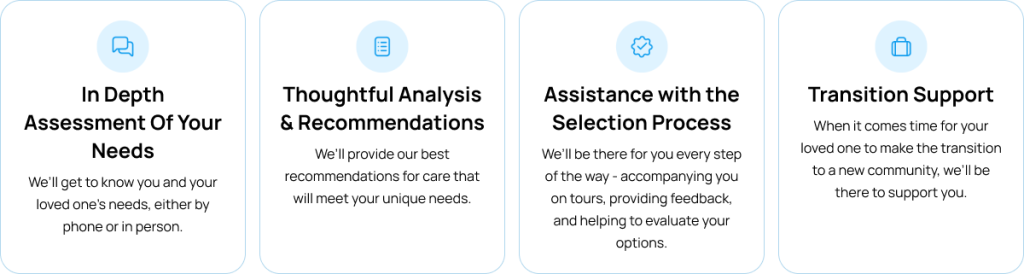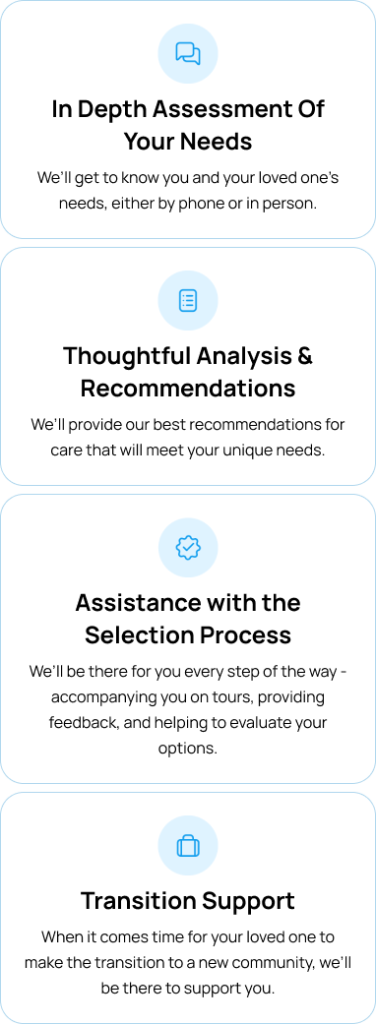 We work only with vetted and screened, reliable caregivers who are committed to improving each resident’s physical and emotional well-being. Our free service links you to experienced experts who are dedicated to providing elderly individuals with the resources they need to live a meaningful, comfortable life. We start by assessing the level of care needed, then propose care solutions that provide both peace of mind and well-being.. Here's what to expect:
